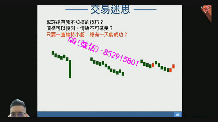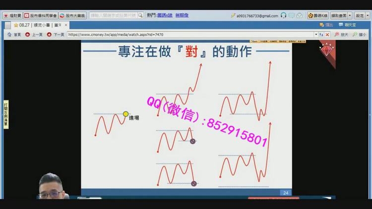 顺流小毕,全职操盘手,CMoney 特约讲师。非凡新闻、聚财网特约嘉宾 元富、群益讲座讲师。 元富、群益讲座讲师 曾任「台湾微软」约聘讲师 「数位指标资讯」前总经理 「普洛斯创意资讯」董事长 课程大纲: 1.交易观念-基础建构/心态准备 2.走势模式-交易周期/盈亏比计算 3.工具应用-移动平均线/判断多空 4.高获利技巧-判断进场时机/选股逻辑 5.顺势选股法-趋势画线法/追踪趋势线 视频截图: