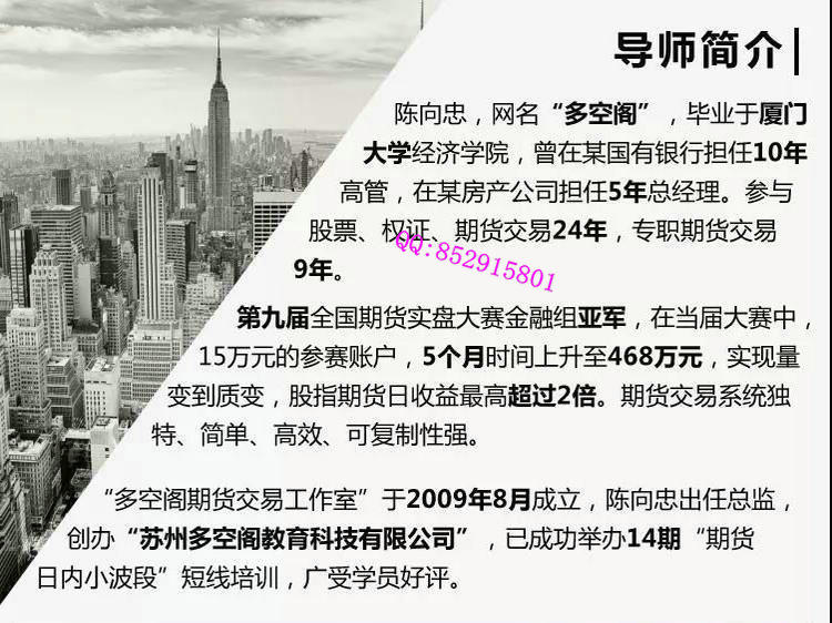 陈向忠,网名“多空阁”,毕业于厦门大学经济学院,曾在某国有银行担任10年高管,在某房产公司担任5年总经理。参与股票、权证、期货交易24年,专职期货交易9年。