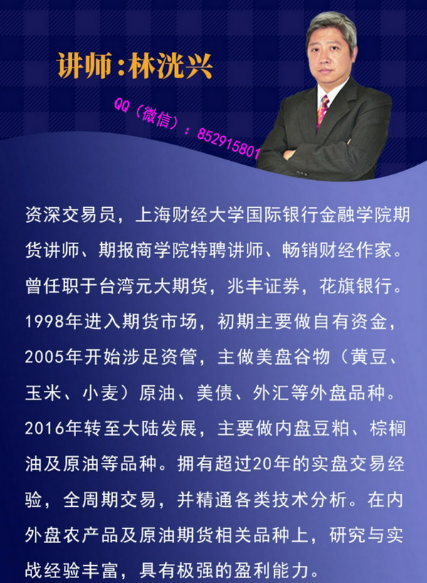 林洸兴,资深交易员,上海财经大学/国际银行金融学院的期货讲师、期报商学院特聘讲师、畅销财经作家。曾任职于台湾元大期货,兆丰证券,花旗银行。1998年进入期货市场,初期主要做自有资金,2005年开始涉足资管,主做美盘谷物(黄豆、玉米、小麦)、原油、美债、外汇等外盘品种。2016年转至大陆发展,主要做内盘豆粕、棕榈油及原油等品种。拥有超过20年实盘交易经验,全周期交易,并精通各类技术分析。在内外盘农产品及原油期货相关品种上,研究与实战经验丰富,具有极强的盈利能力。