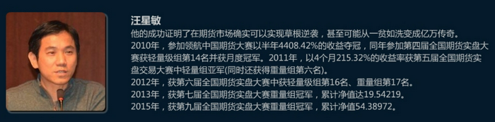 汪星敏被称为"期货奇才”,从2010年起,每年都参加全国期货实盘交易大赛,在第七届和第九届全国期货实盘大赛中荣获重量组冠军。踏入期市二十载,他采用“三位一体”交易法,短中长同时灵活应用,经过近十年的反复锤炼,基本实现了稳定盈利。