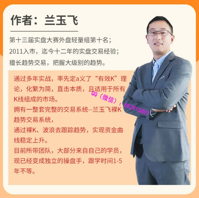 兰玉飞,第十三届实盘大赛外盘轻量组第十名;2011入市,迄今十二年的实盘交易经验;擅长趋势交易,把握大级别的趋势。通过多年实战,率先定义了“有效K”理论,化繁为简,直击本质,且适用于所有K线组成的市场。拥有一整套完整的交易系统--兰玉飞裸K趋势交易系统,通过裸K、波浪去跟踪趋势,实现资金曲线稳定上升。目前所带团队,大部分来自自己的学员,现已经变成独立的操盘手,跟学时间1-5年不等。