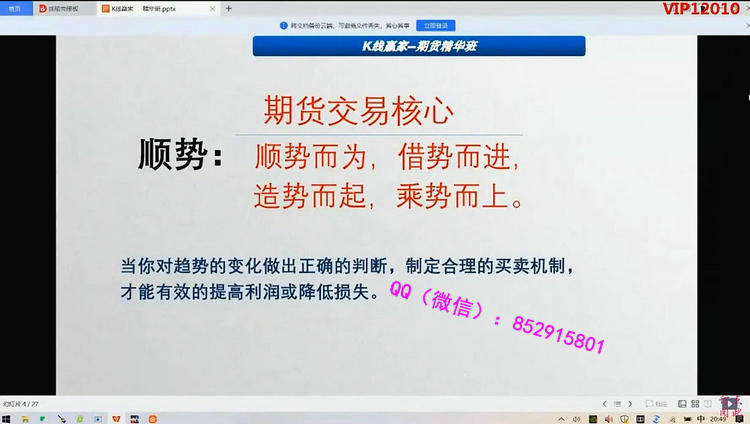 战法特点:1.精准买卖所有交易都是提前挂单,买在起涨点,卖在转折点,精准抄底抓顶2.用止损定量模式,做到小亏大赚3.只看裸K价格,不看其他指标,精准可靠,简单有效,易学习操作4.注重实战,理论学习的同时,答疑解惑胜率高、止损小、复制性极高课程大纲:一、市场本质和投资理念十六字交易方针1.看大做小2.看长做短3.顺势而为4.低买高卖二、拐点趋势交易模型《模型一》(买在启动点,卖在转折点)1K线的理解2多根K线的理解及应用3拐点的认识及布局节点三、核心价格的界定四、核心价格的应用1、趋势转换的标志2.震荡中的波段操作3.过明显的左高点开始回落使用五、资金管理的配置原理1.单品种资金使用上限2.品种结构资金分配原则3.总资金的使用率六、风控管理的原理七、系统组合的应用1.波段低点找拐点2.波段回落用结构视频截图:
