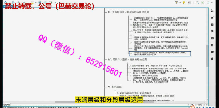 我们的核心课程从市场运行原理,再到对于市场规律的理解,探索其中的必然性,再到把规律转化为交易策略,前几节课是建立对「市场原理的认知」后几节课是「系统构建、交易策略」然后是「资金和仓位的管理、合理的制定计划」的方法最后则是「梳理交易逻辑,并讲解如何自学和回测」快速提高交易水平。课程目录:001.课程介绍002.第一节—建立正确的交易观念003.第二节—市场波动的原理和形式(上)004.第三节—市场波动的原理和形式(下)005.第四节—交易观的构建,如何理解市场规律006.第五节—确定交易逻辑,建立判定体系007.第六节—如何识别趋势信号,层级理论008.第七节—分段理论的细节和演示009.第八节—大小周期同向的分析逻辑010.第九节—小级别介入,轴线策略原理和演示011.第十节——怎么做好突破,突破策略的原理解析012.第十一节—资金和仓位的管理方法013.第十二节—如何制定交易计划014.第十三节—三周期均线共振策略015.第十四节-探讨主动减仓的必要性和方法016.第十五节—保持良好交易心态017.第十六节—学习路径.交易原理解析018.第十七节—学习路径.进场细节019.第十八节—学习路径.仓位管理逻辑020.第十九节—学习路径.复盘事项视频截图: