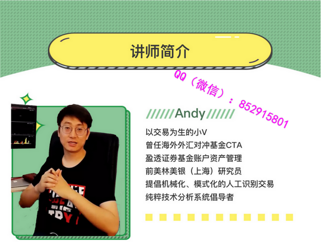 Andy,以交易为生的小V,曾任海外外汇对冲基金CTA,盈透证券基金账户资产管理,前美林美银(上海)研究员。提倡机械化、m模式化的人工识别交易,纯粹技术分析系统倡导者。