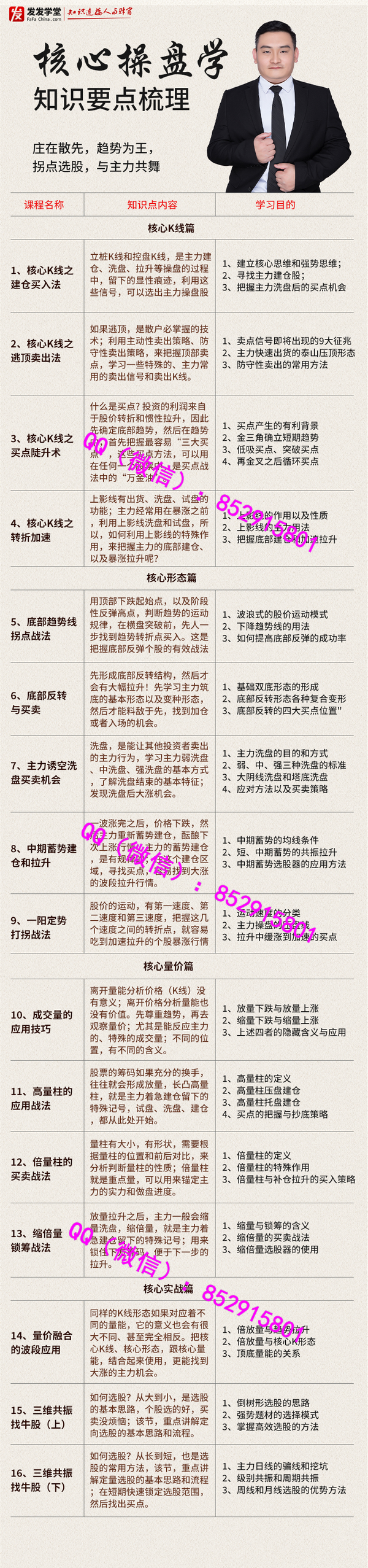 在多年跟踪庄家资金操盘的基础上,擅长通过特殊的核心K线,捕捉主力操盘信号;提炼总结主力手法,归纳形成有大涨潜力的牛股形态;然后寻找启动买点和加速买点,参与主升;风格稳健,以小博大;这就是核心操盘。利用该技术体系,曾在网易举办的专业投顾比赛中,获得三次月度冠军的好成绩。课程目录:1.第一节:核心K线建仓买入法2.第二节:核心K线卖出法3.第三节:核心K线之陡升术4.第四节:核心K线之转折加速5.第五节:底部趋势线拐点战法6.第六节:底部的形成与买卖7.第七节:主力诱空洗盘的买卖机会8.第八节:中期趋势建仓与抢筹拉升9.第九节:一阳定势打拐战法10.第十节:成交量的基础应用11.第十一节:主力高量柱的试盘应用12.第十二节:倍量柱的使用技巧13.第十三节:缩倍量锁筹战法14.第十四节:量价融合的波段应用15.第十五节:三维共振找牛股(上)16.第十六节:三维共振选牛股(下)17.加餐1:盈利的关键要素18.加餐课2:选股的基本模式19.加餐课3:合理的策略致胜20.加餐课4:优化开仓,增加成功率21.结业课:知行合一视频截图: