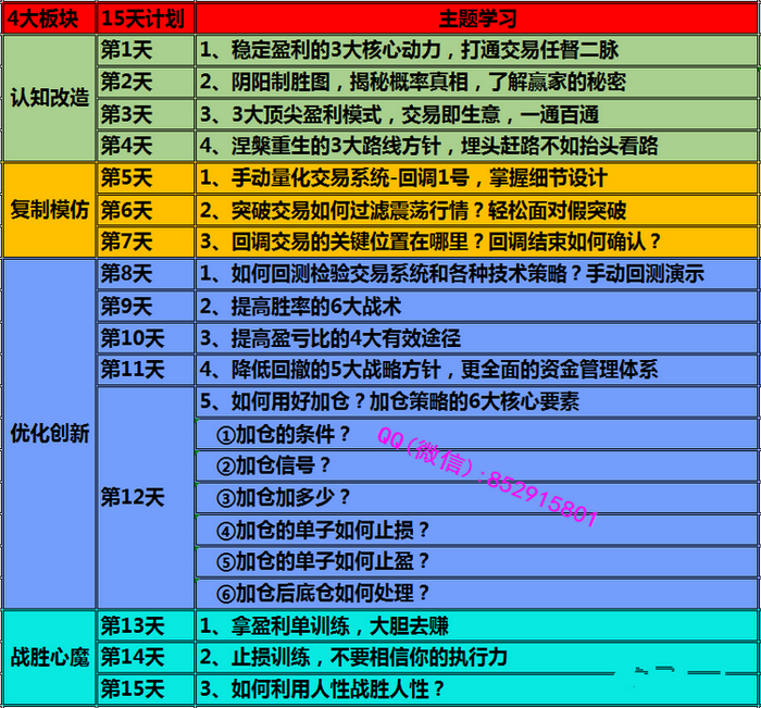本次培训浓缩了理想的白鹤最近5年的实战精髓,涵盖逻辑认知、盈利模式、赛道选择、交易系统细节设计、手动回测、交易系统优化、信号过滤、加仓、数据分析等环节,更加全面化、系统化,方便大家取长补短,提升核心竞争力。4大核心板块,全面提升:①认知改造破解概率密码,打破认知障碍,熟悉盈利模式,避开交易误区。②复制模仿分享1套回调型交易系统供大家借鉴参考,搞定细节问题,不懂编程、0基础的人也能了解量化交易的原理;熟悉震荡优化、回调确认等核心技术,交易更有底气。③优化创新掌握交易系统手动回测技能,解决不会编程的硬伤,学100种技术,不如回测验证1次,自己亲身经历才会对技术深信不疑;熟知交易系统的优化方案,灵活应变。④战胜心魔如果不懂人性,一辈子都要与人性作斗争,回避问题比解决问题更高一筹。课程目录:第1天-稳定盈利的3大核心动力,打通交易任督二脉第2天-阴阳制胜图,揭秘概率真相,了解赢家的秘密第3天-3大顶尖盈利模式,交易即生意,一通百通第4天-涅槃重生的3大路线方针,埋头赶路不如抬头看路第5天-手动量化交易系统-回调1号,掌握细节设计第6天-突破交易如何过滤震荡行情?轻松面对假突破第7天-回调交易的关键位置在哪里?回调结束如何确认?第8天-如何回测检验交易系统和各种技术策略?手动回测演示第9天-提高胜率的6大战术第10天-提高盈亏比的4大有效途径第11天-降低回撤的5大战略方针,更全面的资金管理体系第12天-如何用好加仓?加仓策略的6大核心要素第13天-拿盈利单训练,大胆去赚第14天-止损训练,不要相信你的执行力第15天-如何利用人性战胜人性?视频截图: