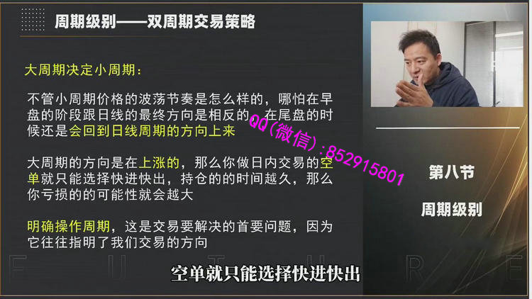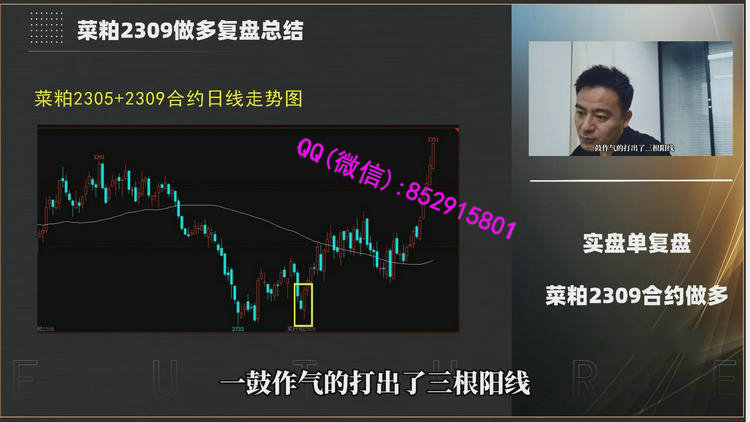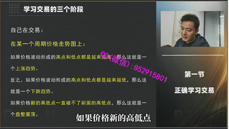 一套系统培训让你少走两年弯路。 学习交易技术只是期货交易中最基础的一步,在技术的基础上,去筛选和系统化,才是能够在期货交易当中盈利的关键。课程目录:1.学习交易的三个阶段2.如何拥有一套交易系统3.交易系统的开仓与平仓策略4.仓位资金管理5.如何设计交易胜率和盈亏比6.多市场多周期交易——裸K交易法7.交易技术的灵魂:量价关系—持仓量8.周期级别——双周期交易策略9.如何正确的复盘10.神奇的ATR实盘讲解应用11.红杏出墙交易战法12.反戈一击交易战法13.3c趋势跟踪战法14.2023.4铁矿石2309合约770做空复盘总结15.2023.5菜粕2309合约3000点做多复盘视频截图: