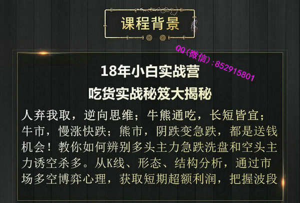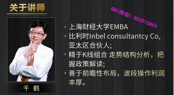 千鹤,上海财经大学EMBA,比利时Inbel consultantcy Co,亚太区合伙人;精于K线组合走势结构分析,把握政策解读;善于前瞻性布局,波段操作利润丰厚。 人弃我取,逆向思维;牛熊通吃,长短皆宜;牛市,慢涨快跌;熊市,阴跌变急跌,都是送钱机会!教你如何辨别多头主力急跌洗盘和空头主力诱空杀多。从K线、形态、结构分析,通过市场多空博弈心理,获取短期超额利润,把握波段。 视频截图: