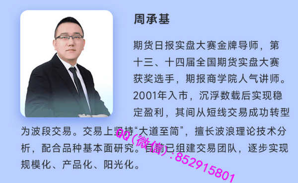 周承基,期货日报实盘大赛金牌导师、期报商学院人气讲师,第十三、十四届全国期货实盘大赛优秀奖选手,荟承科技咨询有限公司总经理,2001年入市,沉浮数载后实现稳定盈利,其间从短线交易成功转型为波段交易。交易理念上坚持滚雪球式复利效应,大道至简。擅长波浪理论技术分析,配合品种基本面研究。目前已组建交易团队,逐步实现规模化、产品化、阳光化。