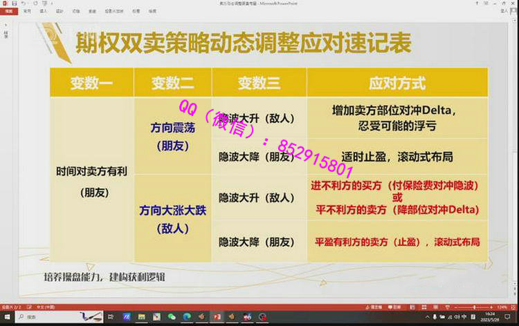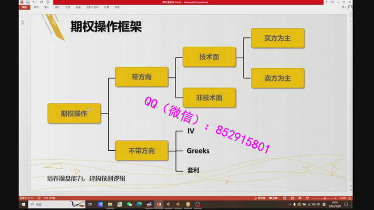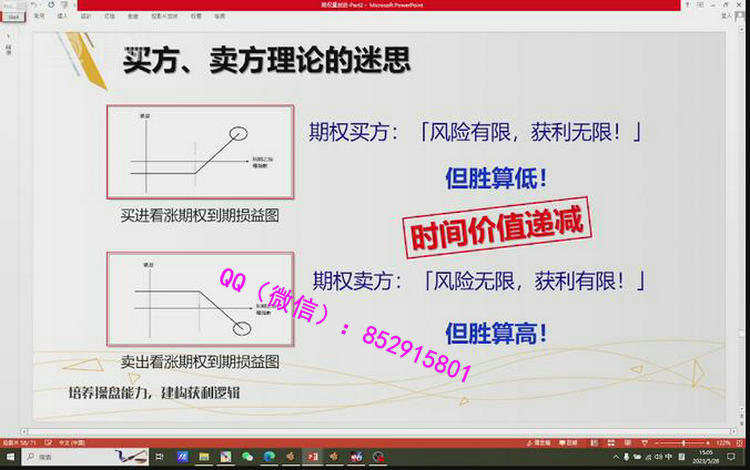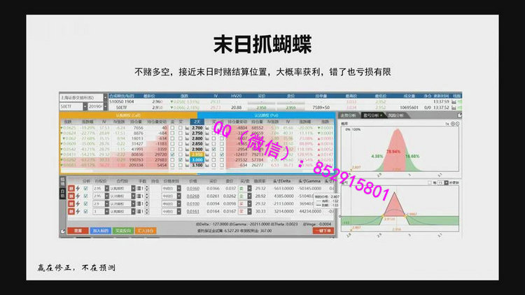 Jack,台湾大学财务金融本科、政治大学会计研究所上海拓璞学堂首席执行官、国内期货商资产管理计划首席顾问、私募团队交易顾问。1995年开始金融交易生涯,开展台指期权业务后,全力投入期权操作。精研买卖点技巧,之后更是全力投入卖方庄家策略,透过对总体部位GREEK的掌控,配合技术面的多空研判,充分发挥商品优势,持续稳定获利。2016年至今,海外衍生品操盘年化报酬率120%坊间很多培训,自称各种绝世技巧,抓顶摸底,五颜六色的,但对投资者是否有效,值得商榷,交易其实不用复杂,真正的核心道理和技巧不神秘,重点在于深度理解,并结合千变万化的市场去活用。正所谓:重剑无锋,大巧不工。把经过时间锻炼的知识经验,扎实学会,才可以无招胜有招。2023年“期权重剑班 ”将由Jack、陈竑廷两位老师,带领大家把握以后人生的期权机会。课程目录:课程1:期权基本功期权买方、卖方赚钱的核心原理买认购、买认沽到期盈亏分析买认购、买认沽未到期盈亏分析时间价值变化分析合成期货的原理与升贴水判断深入理解隐含波动率和历史波动率判断隐含波动率是否合理解析波动率曲面、偏度在实战交易中盈利原理ETF期权、股指期权、商品期权操作上的差异课程2:期权Greeks期权风控基本功Greeks的来源以及实战优劣四大参数解析,Delta、Gamma、Theta、Vega隐含波动率如何影响Greeks如何做到Delta中性什么时候不保持Delta中性专业机构风控参数-Delta Cash、Gamma Cash课程3:买方策略解析-动态调整单腿策略 - 轻仓暴击,克服人性的布局跨式策略 - 事件交易 / Gamma Scalping/末日轮价差策略 - 攻中带守(使用时机与行权价的选择)不等比例 - 赚别人不知道的钱(利用行情与隐含波的结构)日历价差 - 在升贴水、隐含波偏差、行情预判中,做稳健的跨月策略课程4:卖方策略解析-动态调整单腿策略 - 裸卖跟随以及危险点解析跨式策略 - 做空波动率的方法与对冲备兑策略 - 增强收益以及股票新Alpha策略蝶式策略 - 抓结算点、末日平值耗损课程5:买方核心技巧什么时候不适合买期权?结合K线组合与形态,找出行情起爆点什么时候适合买保险?移动进攻如何操作?止损该怎么设定?课程6:买方倍数获利三大核心详解看准标的物:K线可以判气势、知转折、定多空→技术分析见真章进场时机点:不怕买贵、只怕买了以后会不会更贵→续航力的研判期权合约选择:男怕入错行、女怕嫁错郎→看法与做法的结合课程7:K线解析+实战案例抓行情转折:多头吞噬、空头吞噬、上升三法、下降三法顺势交易心法和加仓原理课程8:卖方核心技巧什么时候适合卖期权?如何利用持仓量?近月和远月的抉择如何避免爆仓?压力位与支撑位的判断课程9:卖方稳定收租三部曲详解建仓布局:型态学决定方向及策略→从做市商的角度出发动态调整:通过Greeks精准掌控风险→掌握获利的关键资金控管:平仓、移仓及保证金使用的技巧→风险与报酬兼具的考量课程10:K线解析+实战案例晨星十字、母子十字、夜星十字、多头执带、空头执带假突破与假跌破的判断黑天鹅发生时应对方法视频截图:
