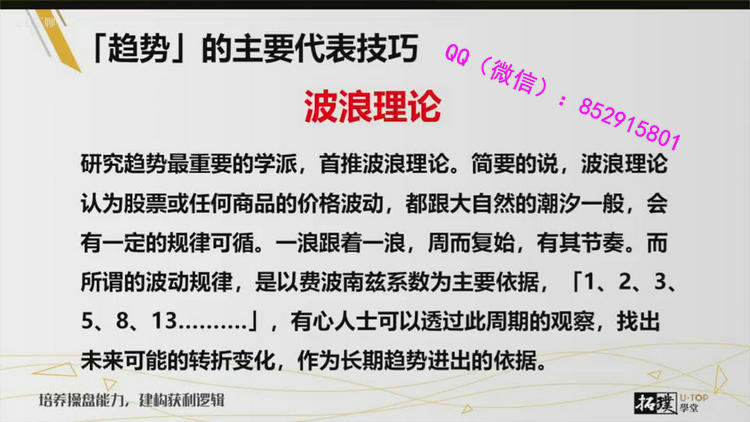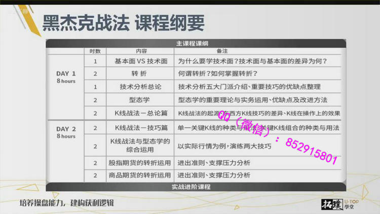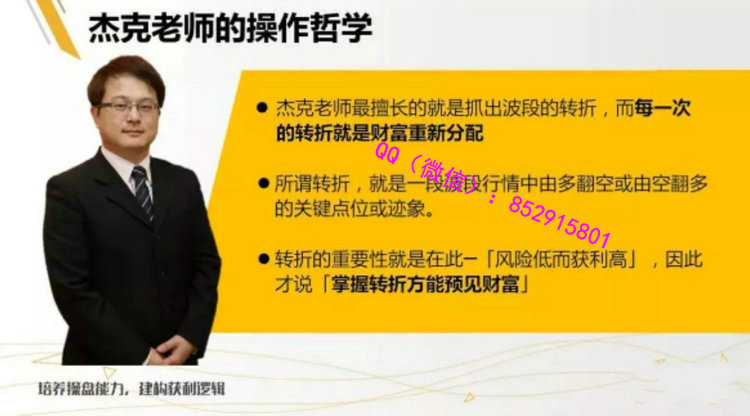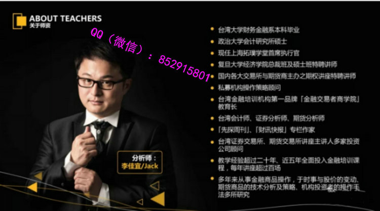 复旦大学经济学院总裁班及硕士班特聘讲师,国内各大交易所与期货商主办之期权讲痤特聘讲师私募机构操作策略顾问,台湾金融培训机构第一品牌「金融交易者商学院」教育长,台湾会计师、证券分析师、期货分析师,[先探周刊、「财讯快报」专栏作家。台湾证券交易所、期货交易所讲座主讲人多家投资公司顾问。课程前言:在金融操作的领域中,很多人认为「股票靠消息、期货靠胆量、期权靠策略」,以市场人性来看,这些商品都能适用技术分析,却在坊间杂乱教学信息的干扰下,让投资人误用许多技巧。技术分析结合人性解析,克服交易弱点,打破二八法则散户宿命,达到大赚小赔的目标,由Jack老师现身说法,亲自带领大家体悟盈利效果。课程目标:本课程旨在帮助任何对技术分析有兴趣的人,掌握交易的核心技能,摒除坊间乱七八糟技术分析理论,以实战经验搭配系统性课程,让一般投资者可以学会真正的技术分析方法。培训内容不仅仅是理论,更是以大量案例传授经验和技巧,构建交易思维,让你加入战队结训后,可以自己独立分析行情,并利用Jack老师的方法获取利润。我们不只是教你学知识,我们不是学校,我们是战队,要带你进入残酷的市场中杀戮!课程内容:1.转折篇何谓转折?如何有效地掌握转折?2.技术分析总论技术分析五大门派:【趋势、型态、量价、指标、K线】优缺点介绍3.型态学形态学重要理论与实务运用、优缺点及改进方法4.K线总论K线战法的起源、东西方K线技巧的差异、K线在操作上的效果5.西方阴阳线西方阴阳线多空组合招式定义介绍、运用法则6.东方关键K线东方关键K线多空组合招式定义介绍、运用法则7.总和运用篇K线战法实盘上的进出准则,招式技巧熟练运用视频截图:
