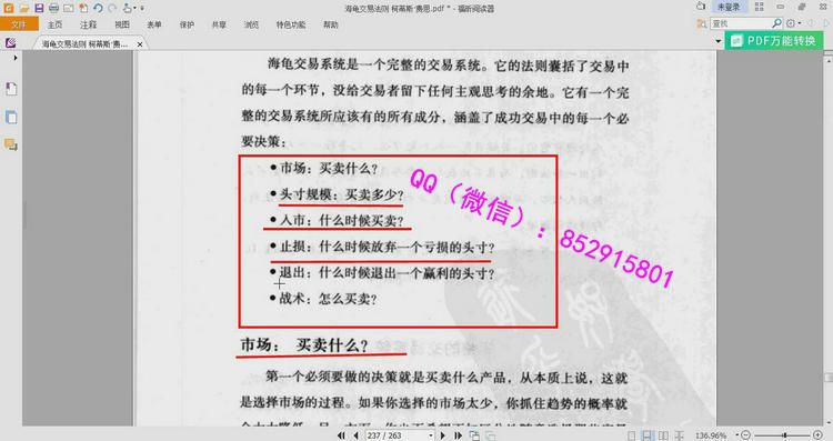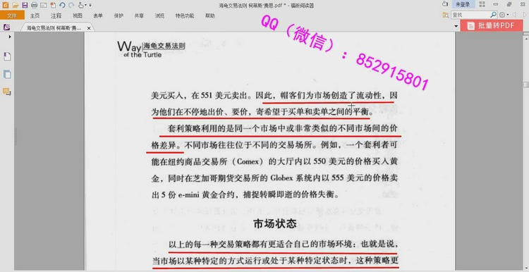 通过学习《海龟操作法》,您将会了解到: 1.海龟们如何做交易,如何把握交易时机; 2. 海龟们如何衡量风险,如何管理资金: 3. 海龟们如何获得超过100%的年均回报率:3.为什么有些海龟大获成功; 5. 如何将海龟交易法则运用于你自己的交易中。《海龟交易法》的渊源:“我们要培养交易者,就像新加坡人养海龟一样。”1983年,交易大师理查德.丹尼斯对他的老朋友威廉.了这么一句话。这原本只是两人之间的一个赌博--伟大的期货交易者 究竟是天生的,还是可以后天培养的?最后却变成了一个传奇性的实验。这个实验中最出类拔萃的海龟柯蒂斯●费思首次透露了整个实验的过程,揭示了丹尼斯和埃克哈特如何在短短两周之内把23个普通人训练成为杰出的期货交易者。他用最浅显易懂的语言详细介绍了海龟参与的一些最重量级的交易,以及它们的时机把握法则,剖析在市场中收获百万利润的要诀一一就 是它们让这些海龟获得了年均80%以上的收益率和超过1亿美元的利润。感谢这个伟大的赌注,丹尼斯向人们证實了华尔街并不完全被天才们垄断,任何智力正常的人都可以成为赢家。他证明了用一套简单的法则,他可以使仅有很少或根本没有交易经验的人成为优秀的交易员。课程目录:01.冒险迷之不同风险承担者-海龟交易法则02.冒险迷之交易者恐慌的背后原因03.海龟思维之交易当中的情绪陷阱04.情绪陷阱之交易过程中的认知偏差05.对常见交易方法的分类06.海龟对常见市场状态的几种分类07.破产风险、风险管理以及交易中的优势08.海龟们的秘诀之量化优势与海龟思维09.严格执行交易中的纪律与强化执行力10.像海龟一样思考之海龟思维小结11.交易过程中应该掌握的优势有哪些?12.如何在交易过程中把握优势13.交易中常见的几种风险14.交易过程中交易系统面临的风险15.对风险承受能力的认知16.造成破产风险的几种个人原因17.海龟资金管理根本原则:生存第一18.海龟风险衡量法则19.系统历史回测的局限性20.交易者效应21.交易者效应的应用22.交易过程中的随机效应23.交易中的优化矛盾24.海龟对交易系统的小结25.交易系统中每一步骤的简单介绍视频截图: