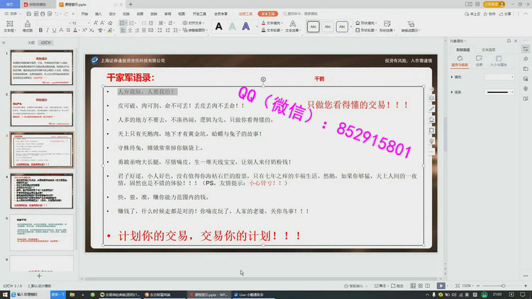 千鹤,上海财经大学EMBA,比利时Inbel consultantcy Co,亚太区合伙人;精于K线组合走势结构分析,把握政策解读;善于前瞻性布局,波段操作利润丰厚。 人弃我取,逆向思维;牛熊通吃,长短皆宜;牛市,慢涨快跌;熊市,阴跌变急跌,都是送钱机会!教你如何辨别多头主力急跌洗盘和空头主力诱空杀多。从K线、形态、结构分析,通过市场多空博弈心理,获取短期超额利润,把握波段。 视频截图:
