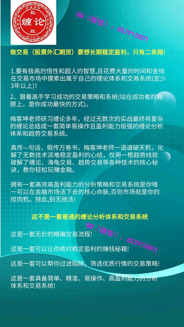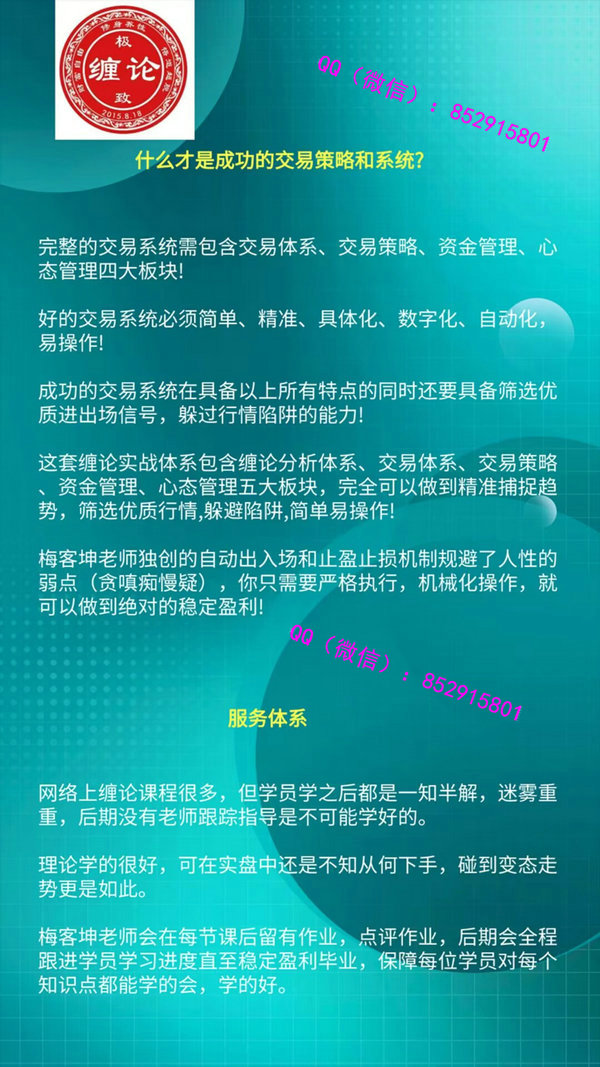 零基础学缠论,将毫无章法的市场彻底庖丁解牛!不可思议的收益曲线,经过训练,你也可以实现!关键是,谁是你的有缘人、领路人!多年缠论研究和实战经验,毫无保留的倾囊相授!运用缠论体系研判市场——扒光市场的衣服,将市场看得清清楚楚、真真切切!课程目录:01.1.开篇:讲述技术分析精髓,让你了解大纲和服务,不迷路02.2课(技术分析的第一步-分型识别 及K线的包含关系处理)03.3.1-30分钟让你明白:笔的定义和划分,怎么画笔,实盘操作04.3.2-MT4基础用法,让你画笔画线段省时30%05.3.3-10分钟笔案例补充,理解后,助你画笔提速50%06.3.4-13个变态走势案例,助你更清晰笔的定义和划分07.4-线段的定义,实盘演示08.5.1-线段的划分:两种情况两种分析,让你画线段不再迷糊09.5.2-线段的划分:两种情况两种分析,让你画线段不再迷糊10.6.1-诸多线段典型案例,助你更清晰线段的定义和划分11.6.2-列举19个难、杂、乱走势图,让你画段不再出错12.7-中枢的定义和画法,实盘演示,让你直观了解13.8-初识三类买卖点,讲解啥时买啥时卖14.9-实盘详解三类买卖点,让你交易更有的放矢15.10-讲解走势级别和走势分解,高级别中枢另一种画法16.11-实盘详解递归分析:如何用大级别走势指导小级别操作?17.12-实盘详解如何让买卖点位更精确,让你想大亏都难18.13-详解走势转折的力度和级别,让你交易更有方向19.14-实盘详解另类交易策略:分型与走势如何联合分析20.15-中枢高级课程:何为中枢扩展、扩张、延伸、新生?21.16-实盘详解级别递减逆向分析_提供个快速分析高级别走势的方法22.17-短线爱好者的_实盘详解如何找到大量超短线买卖点23.18-实盘演示何时下单何时平仓,让你交易有理有据24.19-实盘演示进场策略,助你低风险入场25.20-实盘讲解递归分析_高级别笔如何递归26.21-走势分析高级课程:同级别如何分解?27.22.1-实盘演示同级别分解:如何看懂走势节奏?28.22.2-实盘演示同级别分解后如何交易,靠走势节奏轻松交易29.23.1-趋势系统:均线系统、趋势线30.23.3-趋势系统:保盈、平仓、资金管理、交易心态31.23.2-趋势系统:买卖点、背驰、开仓、止损