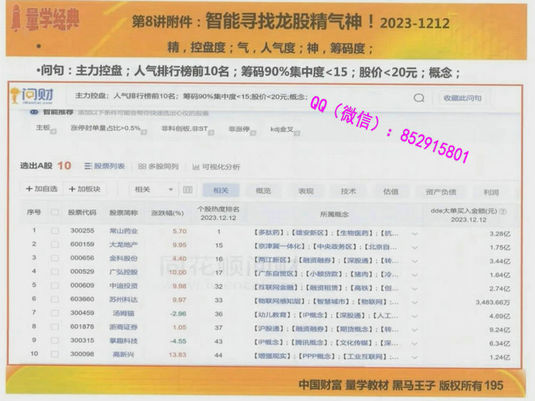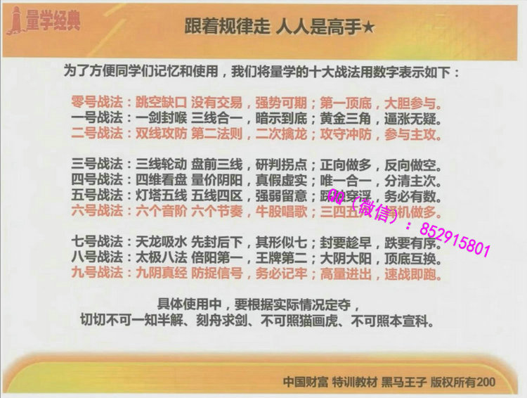 黑马王子,真名张得一,大学教授,创新型学者,发明家,演说家。 2005年创办我国第一个“量柱理论”研究室,第一次将“量柱”作为“股市温度计”进行系统研究,其后又将“量线”作为“股市脉搏仪”,“量波”作为”股 市心电图“进行全面研究,从而完成了“量柱擒涨停”、“量线捉涨停”、“量波抓涨停”三大发明。2007年累计预报217个涨停,2008年累计预报 331个涨停、2009年累计预报365个涨停,并多次提前准确预报逃顶抄底良机,被网友誉为:“我们的股海明灯”!课程目录:01量学保密战法02量学寻宝 标准先导03麒麟送宝 非龙即妖04量学挖宝 黄金配套05二牛牵线 助龙飞天06量学选牛 三底无忧07买阴卖阳 走向辉煌08量学擒龙 志在苍穹09一统天下看盘法视频截图: