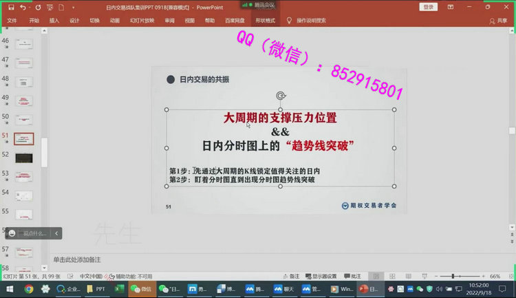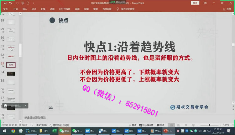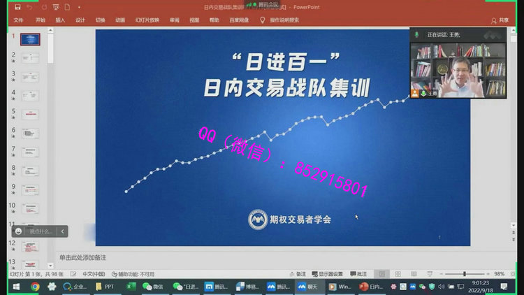 课程大纲:第1部分:趋势线的画法与用法1.趋势线划线的三原则2.趋势线的有效性与有效期3.趋势线的3割用法4.好用且精确的画线工具第2部分:日内交易中的关键支撑与压力位置1.方法12.方法23.方法34.方法45.方法5第3部分:日内交易的快行情与优势点位1.怎么判断标的运行速度2.怎样识别快点(爆发点)3.入场即浮盈的优势点位4.用“共振技术”逮住优势点位的心法6.论目标位第4部分:下单撤单与止盈止损1.下单的节奏2.什么时候撤单3.止盈的方法4.止损与风控5.日进百一模式的资金分配6.日内交易的风控模板第5部分:很关键的心法1.频率2.胜率3.不相关与可复制4.戒律第6部分:软件与流程1.日内短线交易的品种选择2.期货盘口与关键价格3.软件的使用与配置4.盯盘与下单的动作5.手续费的相关细节