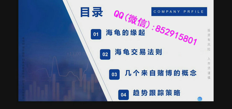 持续放量时,关注搏杀的机会;超买超卖时,关注行情拐点的机会;低估值个股,关注长线持有的机会。学习目的目的一:读懂K线语言,指标配合的应用。目的二:把控盘中的异动,培养.辨析能力以及应对技巧。目的三:结合短线池把控短线票的出击与防守,掌控观测点与对应操作。目的四:树立正确的操作理念。课程目录:01导读-海龟的缘起02非牛市赚钱秘籍(上)03非牛市赚钱秘籍(下)04行为金融学(上)05行为金融学(中)06行为金融学(下)07避免思维陷阱(上)08避免思维陷阱(下)09系统的重要性(上)10系统的重要性(下)11建立估值体系(上)12建立估值体系(下)13风险(上)14风险(下)15资金管理(上)16资金管理(下)17生存第一法则(上)18生存第一法则(下)19从风险控制到投资积木(上)20从风险控制到投资积木(下)21常用趋势跟踪积木(上)22常用趋势跟踪积木(下)23趋势系统的应用(上)24趋势系统的应用(下)25DMI积木的应用(上)26DMI积木的应用(下)27交易者效应(上)28交易者效应(下)29随机效应30给投资者的忠告视频截图: