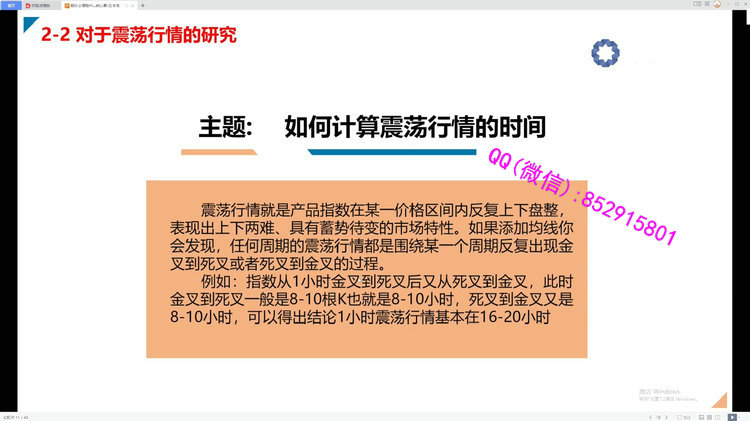 特色内容1、以“技术分析”作理论2、以“波段”作主要交易风格3、创新使用“金叉死叉’4、正确应用“看大做小”5、重新定义上涨和下跌的“结构课程目录:模块一:时间周期的特征1、金死又交替的正常K线根数2、周期之间的转换模块二:对于震荡行情的研究1、震荡行情是如何产生的2、如何计算震荡行情的时间3、日内交易时间长短对震荡时间的影响模块三:如何预判行情的大小1、时间周期和行情大小的关系2、通过周期预判上涨和下跌的时间模块四:均线分布和斜率对趋势的判断1、均线斜率是什么2、用假设性开仓来判断是否逆势模块五:对应周期表1、对应周期表(核心)2、对应周期表和震荡周期的关系(核心)3、如何拿单(波段和长线)4、波段和趋势行情的最佳转折点5、如何开仓、止损模块六:复盘的重要性以及如何复盘1、复盘的重要性是寻找开仓机会2、如何复盘视频截图: