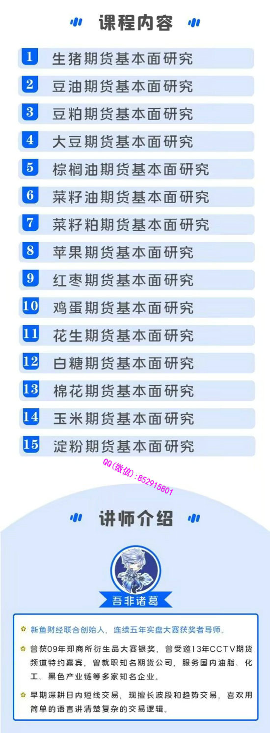 课程目录:001.生猪期货基本面研究002.豆油期货基本面研究003.棕榈油期货基本面研究004.菜籽油期货基本面研究005.黄大豆期货基本面研究006.豆粕期货基本面研究专题007.菜籽粕期货基本面研究专题008.苹果期货基本面研究009.红枣期货基本面研究010.鸡蛋期货基本面研究011.棉花期货基本面研究012.白糖期货基本面研究013.花生期货基本面研究014.玉米期货基本面研究