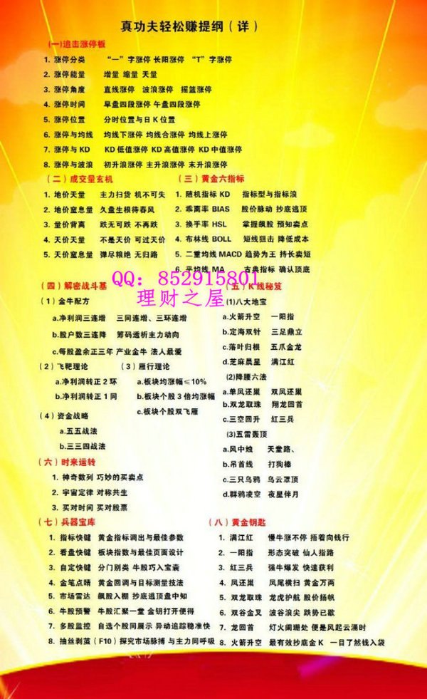 (一) 追击涨停板→火树银花 洞悉真龙(二) 成交量玄机→天量 地量 窒息量(三) 黄金六指标→金叉死叉 涨停先机(四) 解密战斗基→活用数据 预知未来(五) K线秘笈 →抄底逃顶轻松赚(六) 时来运转→时间奥秘 神乎其技(七) 兵器宝库→金笔生花 画龙点睛(八) 黄金钥匙→秒杀牛股 飙股自求