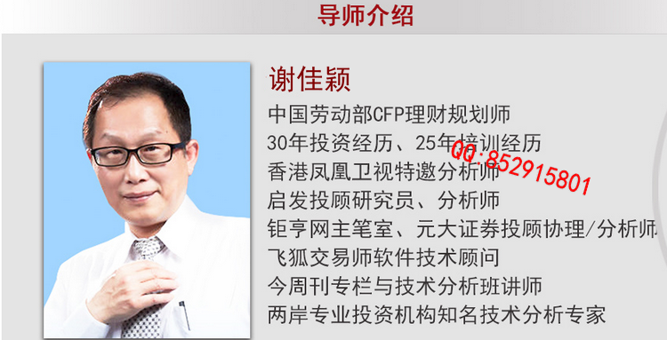 谢老师是主控盘在李教授众多学生中最为重要的代表人物。其本人独创的指标战略K线、教战心法等为主控学做出了重要的贡献,从而奠定了一代宗师的基础。谢老师历任巨升资讯研训部经理,铭传大学金融投资讲师,启发投顾研究员、分析师,天富投顾分析师,飞狐证券软件技术顾问等职。现任日盛投顾分析师,凤凰台(股市直通车)分析师。著有《计算器概论》、《技术分析教战原理》《主控战略K线》《主力控盘操作学》等著作。如今早已名满华人圈,桃李遍天下。和讯证券软件飞狐软件,就曾获得谢老师的无私支持,而收有其本人独创的主力控盘的特色指标。因此谢老师的技术观念实际早已惠及大陆部分股民。尤其《主力控盘操作学》简体版在大陆得以发行,让更多的人首次见识了主控盘的思考逻辑的宝贵之处,而引起了无数共鸣。