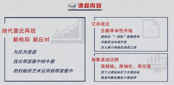 ◆ 课程内容:一绝代豪庄再现,新格局,新应对后徐翔时代全新赢利模式,最强悍的资金,开创最刺激的套路,帮派资金林立,不得不重视。无论指数如何震荡,几乎每月都会有一两只成妖的牛股出现,同时还会有若干协助的强势股。特别是近期,已经上升到游资愿意去给强庄抬轿的地步。帮派股解析!将是此次课程的重点,经过长达一年的细心拆解,本次课程将解决如下课题:如何找出帮派股中的牛股?如何与庄共进退?如何把封板的艺术运用到帮派股中?以下是帮派厮杀中的一些经典牛股:上峰水泥、同力水泥、天山股份、太阳电缆、柘中股份、南京港、林海股份、宝色股份、华钰矿业等等。二 封板再强化,首次深入探讨单板的进退之道1.复盘分析去年下半年至今所有的封板股的买卖点。2.强化丰富封板内容和细节。(1)帮派股和封板的结合运用。(2)双板之后该如何观察和操作个股。(3)什么板不能打、什么板可以打。(4)探讨个股单板之后会出现哪些变异。双板后的部分内容为全新推出,单板战法则属于高端升级,对泛舟剑谱的一次革命性提升。