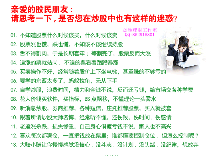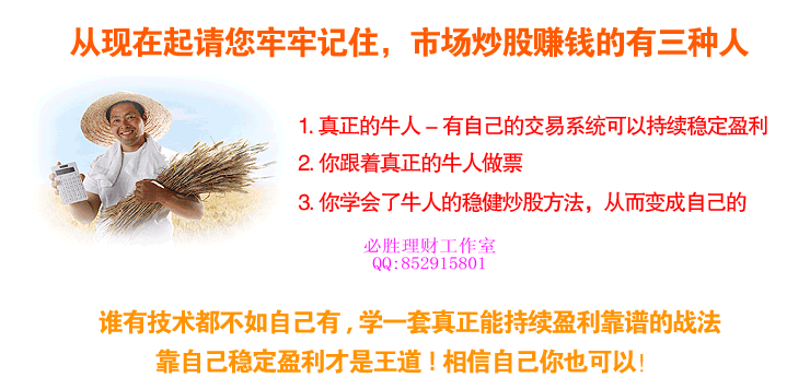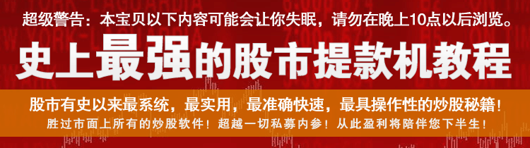 内容: 北京牛蒡老师提款机教程资料,包括量子盈利法、畅行无限乾坤圈、牛股三级跳三部分资料。 每部分包含视频、文字说明和通达信指标。 附加通达信精简极速版软件(4M,超快,已导入上述指标)+超赢主图指标+六脉神剑指标。 赠送牛蒡老师原作:1)原版判断大盘天当涨跌法(视频) 2)年入百万秘籍之每天四小时(文档) 3)股市8大骗局解密(文档)