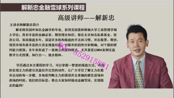 课程目录: 主力建仓的六种动作 主力洗盘的七种方法 主力拉升的六种方法(上) 主力拉升的六种方法(下) 解新忠讲课之债券分析 主力突破的五种方法 主力出货的八种方法上 主力出货的八种方法下 主力筹码的四种表现 主力量能的四种表现 解新忠金融雪球课程之个股买卖点 个股精准的买卖点--短线 新股如何操作 解新忠金融雪球课程之牛股基因特征 超级大牛股的六种判断