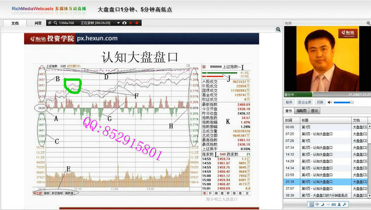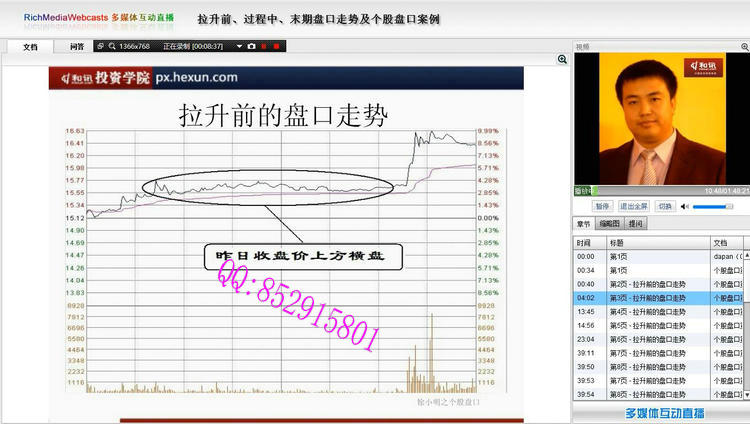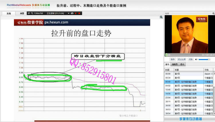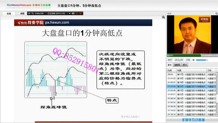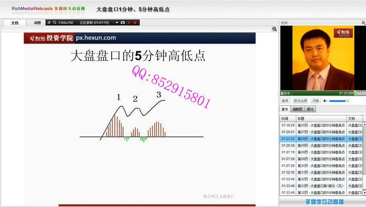 讲师介绍: 徐小明:和讯投资学院特级教授,知名财经博主、财经评论员。博客点击量23亿,全国第一。拥有规模资金运作经验,在盘口、策略、交易系统等方面有很深的造诣和理解。 著作:《盘口》、《数字化定量分析》 视频截图: