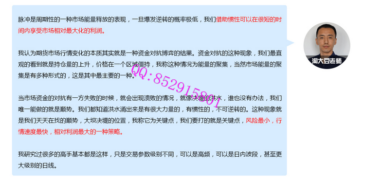 “淘大豆”老师90年代进入期货行业,熟识国内外诸多大腕级交易员的操盘手法,经多年潜心研究总结了一套独特的交易理念:用高频的手法解决了短线、波段交易中的资金回撤问题,有效地控制了风险,充分放大了利润。