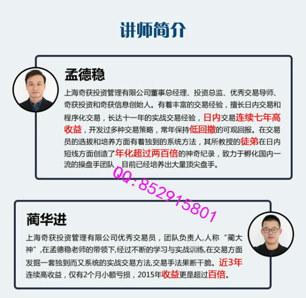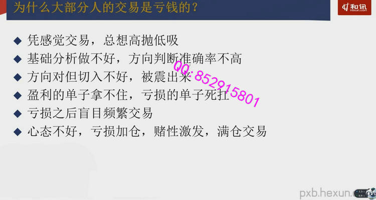 1、怎样训练交易才能更高效的步入正循环?2、为什么大部分人的交易是亏钱的?3、如何实现持续稳定的赢利?4、交易系统循环框架5、如何定势定方向?6、如何寻找最佳的切入点?7、止盈的原则与方法8、逻辑止损、时间止损、固定止损与多重防火墙9、最佳的单量配比与加减仓方法10、交易频率的缩放11、多空周期的简单划分与复杂演化12、周期的叠加与结构的优势13、形态与K线组合如何才能发挥最大效力?14、品种相关性的具体应用技巧15、关键点分析16、量价配合的真谛17、盘口的静态与动态分析18、盘口的衰竭与停顿点解读19、技术指标的叠加确认20、如何规避无效行情21、高胜率交易的法宝:交易十问22、微观形态做法23、信息不对称做法24、现货短周期预测做法25、商品期货和金融期货的不同运用26、实盘录像的反复解读27、细节的完善与固化28、个性化交易系统的建立29、交易蜕变的核心条件30、如何形成完善的心智体系?31、如何培养强大的执行力?32、改变对亏损的认知和处理33、如何养成客观公正的态度34、逆境处理的成熟体系35、形成对交易体系的超强信念36、盘前的准备与盘后的总结视频截图: