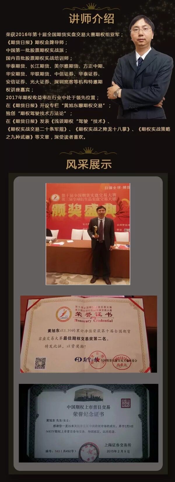 第十届全国期货实盘交易大赛期权组亚军,《期货日报》期权金牌导师,中国第一批股票期权实战派,国内首批股票期权实战培训师,多家机构特邀期权讲座嘉宾,《期货日报》开设专栏:黄旭东聊期权交易、期权驾驭术。