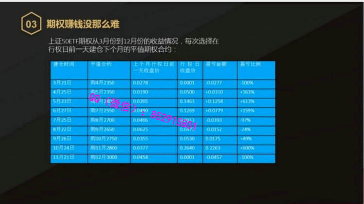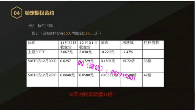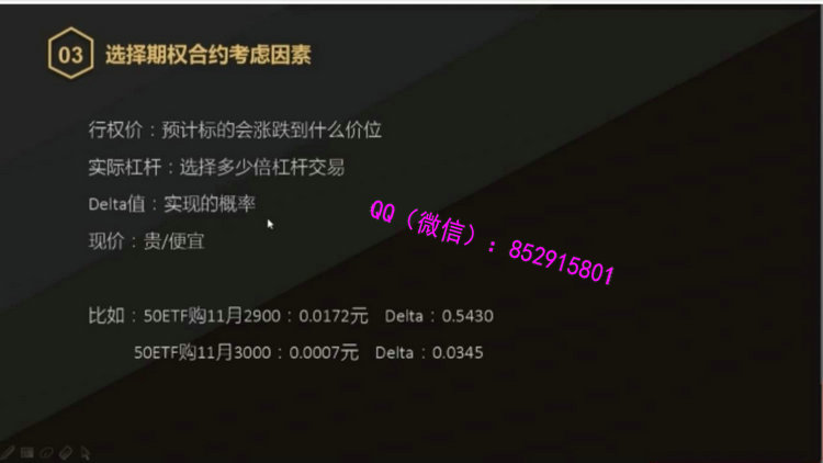 课程背景期权被誉为金融衍生品皇冠上的明珠,是国际市场上主流的交易品种,是一种功能强大的金融工具,期权可以用来投机,也可以用来投资,还可以做风险管理。期权市场经过2017年的快速发展,目前三个品种的流动性越来越好了,特别是50etf期权,是最火爆的品种。今年将迎来期权市场的爆发期,未来期权的发展空间巨大,所以你不得不学期权。期权的投机功能,通俗地说就是穷人翻身的工具,只要市场有一波趋势行情走出来,你就能在短时间内成为百万富翁。期权的投资功能,当你拿着上证50ETF的成份股或商品期货时,搭配对应的期权可以做到收益更稳健,用期权可以为你带来每年10%左右的确定性收益,相当于买股票或期货收租金一样。期权的风险管理功能,是个人投资者做空的最好工具,股票市场就缺做空工具,你可以用期权来保护你的股票,让你从容面对大幅度下跌。期货市场用期权来做风险管理,也是非常有优势的。课程目录:1、精准锁定合约,助力财富增值2、期权暴利的交易方法解析3、期权赚钱没那么难4、从短线到长线的期权战法5、买入认购期权后如何应对6、买入认沽期权后如何应对7、一种简单有效的高赔率交易方法8、短线盈利就这么简单视频截图: