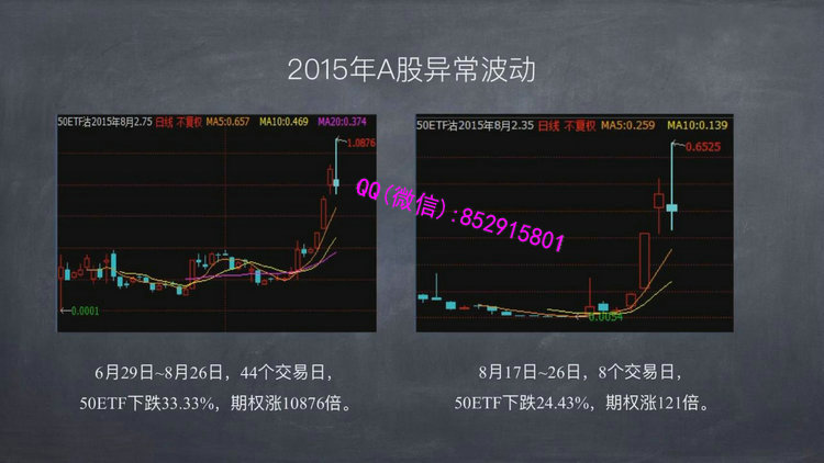 期权是最容易产生短期暴利的交易品种,在行情火爆时,可能一两个月就能实现上百倍甚至上千倍、上万倍的收益。比如2015年1月15日的瑞郎事件,随着瑞士央行宣布瑞郎与欧元脱钩,瑞郎汇率应声上涨了30%,短短的几分钟,瑞郎的虚值看涨期权就出现了一万倍的涨幅。再例如A股市场,2015年6月29日~8月26日两个月的时间,上证50指数下跌37.47%,“8月沽2750”这个期权合约从最低1块钱涨到最高10900块,涨幅同样是一万多倍,这是任何股票与期货品种都无法比拟的超高收益。