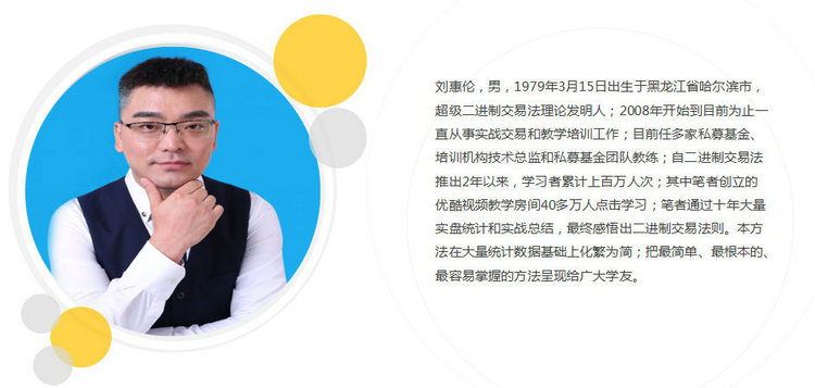 刘惠伦:《趋势交易法》发明人,国家“七五”攻关《石英浮选技术研究》和“八五”攻关《锆英石除铁技术研究》项目负责人,在1990年获得国家科技进步二等奖。1993年开始对外汇交易产生浓厚兴趣,从此开始长达17年的交易生涯,并于1995年5月11日在北京创造单日盈利76万美元的神话。善于研究和创新的性格是他能够在交易领域成功的最主要原因。在交易过程中,他不断总结、研究和创新,创立出一套独特的、轻松的交易方法——《趋势交易法》。鹿希武先生自1993年进入交易领域以来,交易从未间断,17年的交易经历是他宝贵的财富,积累了丰富的实战操盘经验。