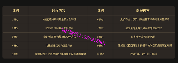 课程目录:第1节:K线的组成结构思维及分化特征第2节:K线的级别问题及变化思路第3节:揭秘K线的所有规律和使用方法第4节:均线基础以及均线是什么第5节:掌握均线的平衡规律以及K线所影响均线的规律第6节:太极均线,以及均线的基本结构对走势的影响第7节:成交量的量群及换手率的使用方法第8节:众多涨停敢死队的方法第9节:股知道《轮回理论》的基本教学以及提高班的辅导第10节:结构平衡,数字因子揭秘