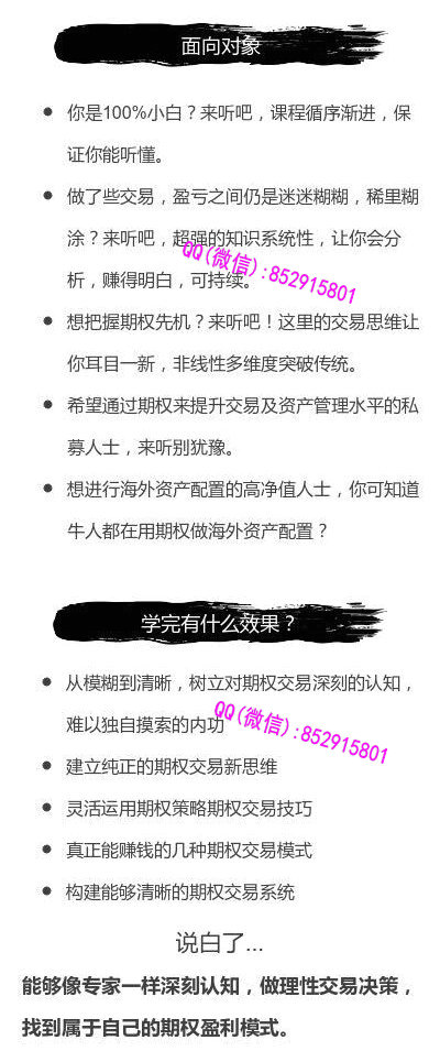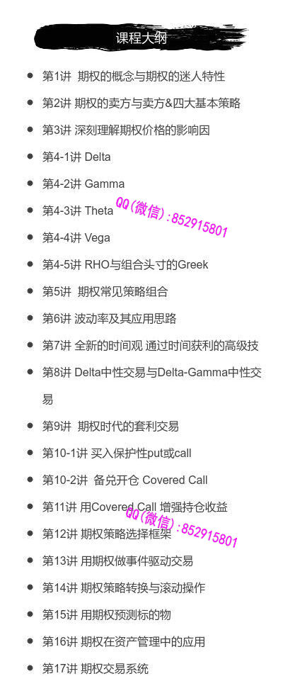 ●从模糊到清晰,树立对期权交易深刻的认知,难以独自摸索的内功●建立纯正的期权交易新思维●灵活运用期权策略期权交易技巧●真正能赚钱的几种期权交易模式●构建能够清晰的期权交易系统说白了..能够像专家一样深刻认知,做理性交易决策,找到属于自己的期权盈利模式。面向的学习对象:●你是100%小白?来听吧,课程循序渐进,保证你能听懂。●做了些交易,盈亏之间仍是迷迷糊糊,稀里糊涂?来听吧,超强的知识系统性,让你会分析,赚得明白,可持续。●想把握期权先机?来听吧!这里的交易思维让你耳目一新,非线性多维度突破传统。●希望通过期权来提升交易及资产管理水平的私募人士,来听别犹豫。●想进行海外资产配置的高净值人士,你可知道牛人都在用期权做海外资产配置?课程大纲目录:第1讲:期权的概念与期叔的迷人特性第2讲:期权的卖方与卖方&四大基本策略第3讲:深刻理解期权价格的影响因第4-1讲:Delta第4-2讲:Gamma第4-3讲:Theta第4-4讲:Vega第4-5讲:RHO与組合寸的Greek第5讲:期权常几策略組合第6讲:波动率及其应用思路第7讲:全新的时间观 通过时间获利的高级技巧第8讲:Delta中性交易与Delta-Gamma中性交易第9讲:期权吋代的套利交易第10-1讲:买入保护性pu或call第10-2讲:备兑开仓Covered Call第11讲:用Covered Call增强持仓收益第12讲:期权策略选择框架第13讲:用期权做事件驱动交易第14讲:期权策略转换与滚动操作第15讲:用期权预测标的物第16讲:期权在资产管理中的立用第17讲:期权交易系统培训视频截图: