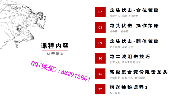 课程目录:1.龙头量形揭秘2.龙头建构揭秘3.龙头基因揭秘4.龙头捕捉揭秘5.龙头伏击揭秘6.赠送神秘课程17.龙头伏击-仓位策略8.龙头伏击-操作策略9.龙头伏击-翻倍策略10.龙二波狙击技巧11.高级集合竞价狙击龙头12.赠送神秘课程2视频截图: