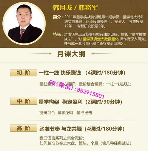 培训课程大纲:初阶:一柱一线 快乐赚钱(4课时/180分钟)量柱精解;价柱精解;量价结合精解;一柱一线战法;