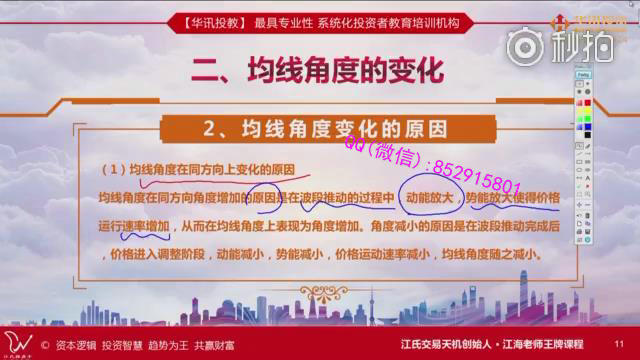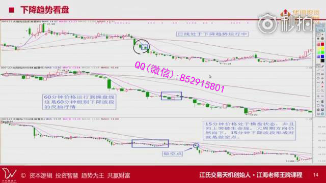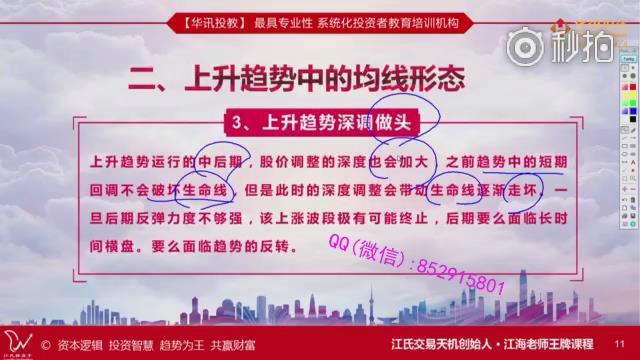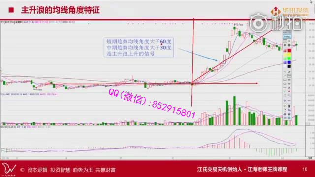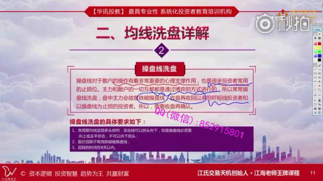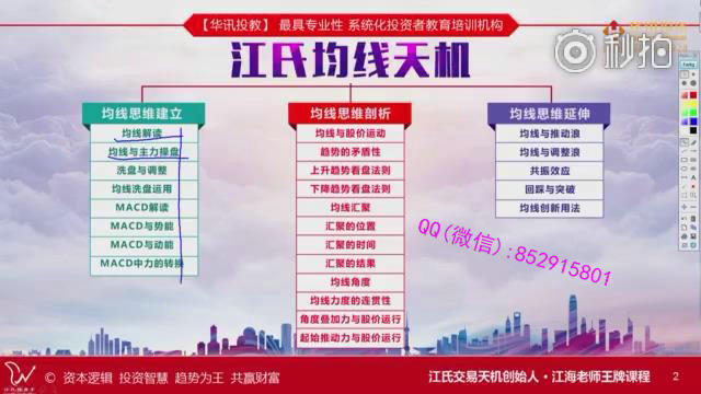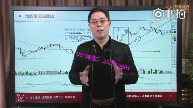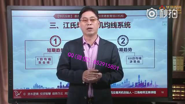 江海(孙清),江氏交易体系创始人,被誉为“华人K线王”,独创股市庄家量能博弈体系。华讯投教首席培训导师,担任多家阳光私募的投资总顾问,曾任复旦大学证券研究所投资者教育基地副主任、复旦大学证券研究所高级研究 员,具有丰富的职业操盘手培训经验,数年来为国内 私募输送了大批顶级的优秀技术分析师。2014-2015年带领投资团队在一拖股份、山鹰纸业、达安 基因、万马股份等牛股的投资中取得了骄入的收益。在系统高级课程中,因《赢在起跑线》《股市实 战擒庄绝技》《涨停因子与量价关系解密》等王牌课 程在投资者中享有极高的知名度,其所著的《赢在涨停》、《波段为王》、《盘口天机》等高级操盘手内训教材已成为新晋操盘经典。培训视频截图: