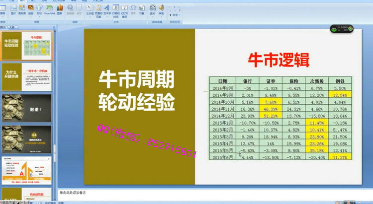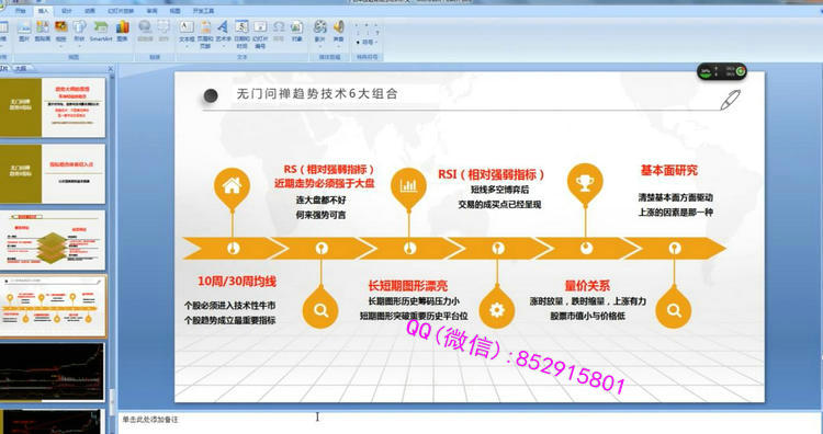 第二篇无门技术组合体系第六讲:无门问禅趋势组合六指标第七讲:详解股神指标: RSI一公开短线买卖点最神奇指标第八讲: RS与重要均线1. RS的运用与设置技巧2.认识重要均线的意义第九讲:斐波纳契独特技巧第十讲:趋势通道平台技术第十一讲:趋势股的量价关系一破除成交量认识的迷雾第二部:十倍牛股实战篇第十二讲:趋势交易核心理念第十三讲:趋势牛股技术密码2/3第十四讲: 趋势牛股案例剖析第十五讲:趋势牛股交易策略第三部:波段交易实战篇第十六讲:波段交易的要义第十七讲:形态选股的秘密第十八讲:超卖选股的秘密第十九讲:通道选股的秘密培训视频截图: