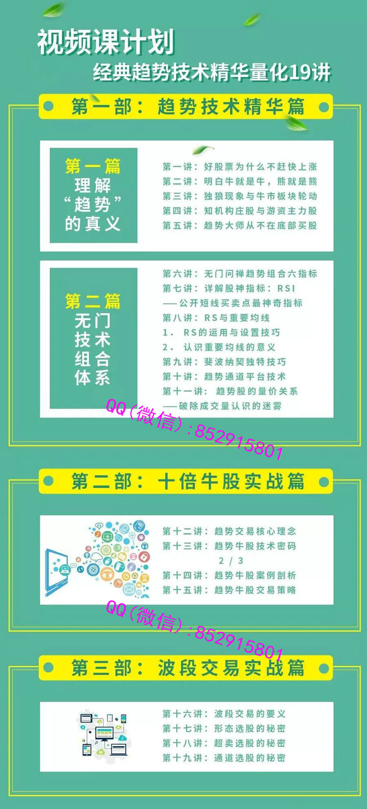 这次开课,原计划只讲股神指标RSI+十倍趋势牛股战法+五节视频课,这样可以轻松点。现在拓展成为三大部份:第一、核心技术课。在股神指标RSI外:一是增加斐波纳契比列独特运用技巧,这是我判断指数回调的重要指标,说它独特是因为我的划法与普通划法是不一样,是向经典技术高手学来的。二是补充趋势通道平台技术,这一段时间很多板学朋友在问趋势通道平台这本书,我们没有了,所以把这个技术的要点加进去了。第二,十倍牛股趋势战法这是原来计划的核心课程,向你揭示发现趋势牛股的九大技术密码!第三,三大波段核心战法这是新增加的内容。增加的原因也是因为这一段不少朋友反映,上了一只趋势好股总是拿不住,没有赚到钱还被套,有必要把这个短线技术教给大家!另外,还专门增加了几篇本来和这个课没有太大关系的文章作为附件!主要是关于牛熊周期我个人的一些独特见解,特别是关于熊市的,想和大家做一个分享,现在也许对你没有用,牛市结束后对你会有大用!所以,整体课程作了扩展,视频课已由原计划的5节,一下拓展到19节,比板学还多了10节。课程目录:第一部:趋势技术精华篇第一篇理解:趋势”的真义第一讲:好股票为什么不赶快上涨第二讲:明白牛就是牛,熊就是熊第三讲:独狼现象与牛市板块轮动第四讲:知机构庄股与游资主力股第五讲:趋势大师从不在底部买股