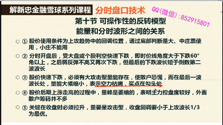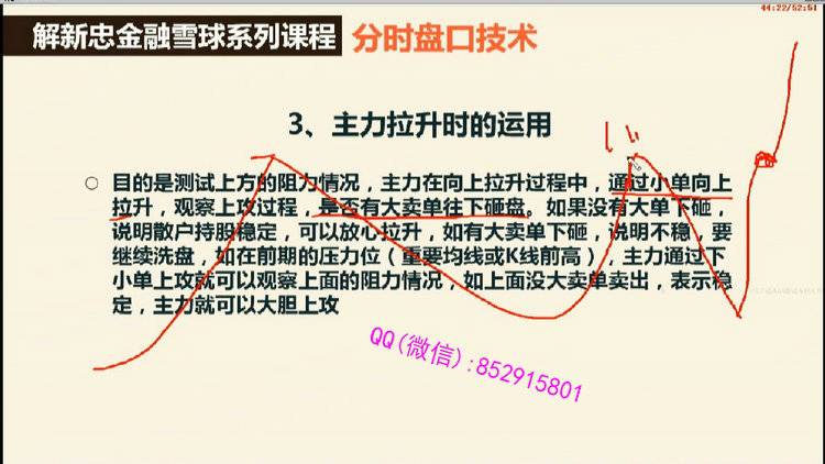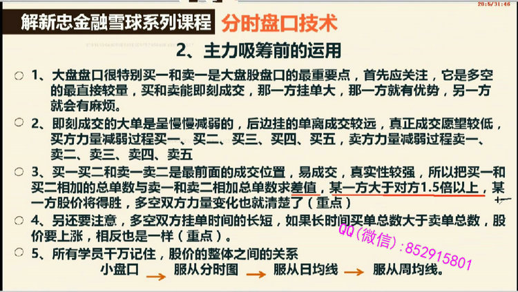 学员通过本次课程的学习,可以掌握-整套的操盘方法,有效]的发现主力的建仓洗盘拉升出货的动作,让广大学员了解主力在股市运动的每一步骤,多角度判断主力的强弱并且准确的抓住进场和离场的时机。我们的目标是:教会大家如何撬动金融雪球,实现稳定的赢利!课程目录:1.第一节:分时图小盘口挂单深度研究——排山倒海式挂单2.第二节:分时图小盘口挂单深度研究——诱骗型托单3.第三节:分时图小盘口挂单深度研究——夹板式挂单的主力运用4.第四节:分时图小盘口挂单深度研究——散单式挂单的运用5.第五节:分时图小盘口挂单深度研究——无主力大单的挂单6.第六节:分时图主力量能的语言——主力针尖型冲击量的语言7.第七节:分时图主力量能的语言——主力密集型攻击量的语言8.第八节:分时图主力量能的语言——主力反转量的语言9.第九节:分时图操作模型——尾盘操作模型10.第十节:分时图操作模型——可操作性的反转模型11.第十一节:分时图综合操作和识别12.第十二节:分时图综合操作和运用13.第十三节:涨停板分时图的研究14.第十四节:涨停板分时图的研究15.第十五节:股市交易核心技术之背离深度研究16.第十六节:股市交易核心技术之短、长周期背离17.第十七节:股市交易核心技术之指标背离的综合运用——CCI指标背离之顶底判断18.第十八节:股市交易核心技术之指标背离的综合运用——MACD柱线背离19.第十九节:股市交易核心技术之指标背离的综合运用——MACD的大小关系20.第二十节:股市交易核心技术之指标背离的综合运用——DIF和DEA的精解21.第二十一节:股市交易核心技术之MACD均线量能筹码背离等综合运用22.第二十二节:股市交易核心技术之资金管理模式23.课程总结培训视频截图: