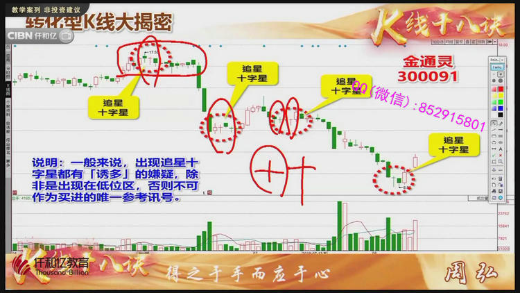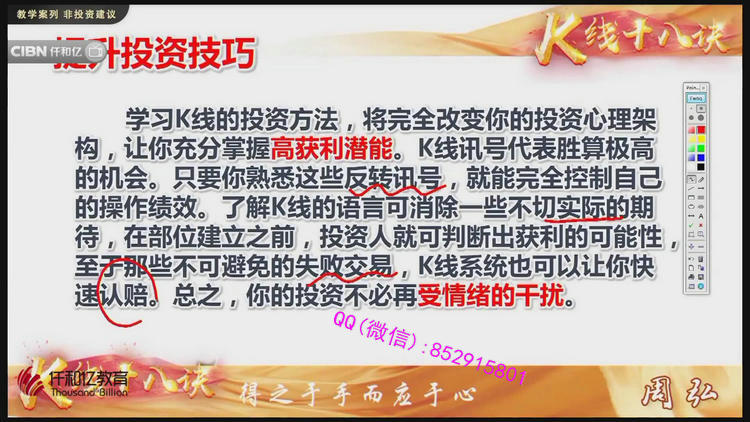 K线有领先价格发现的优点,因此如何正确的学习K线﹐也是所有股民必修的一门功课。传统的酒田K线战法,标准招式一共有78招,这是先人的智慧故能留芳百年。经过本人多年的研究,酒田战法中有许多的型态类似的居多,而且也不见得适用到现在的股市,为了更能契合现在的股市﹐经过本人的焠炼简化之后﹐将K线中最常见的型态进行整合﹐整理出有十八种最重要的型态﹐这就是本人所独创的-K线十八诀。学习「K线十八诀」最重要的价值﹐就是从K线的型态中看出「市场的动态」﹐从每一种K线形态中,充分了解到每一种背后所代表的意义,更能深入了解到K线背后所代表的语言,则是本檔的教学重点。课程大纲:一、转化型K线二、反转型K线三、震荡型K线对应型态:上阻(大敌当前)VS下阻(背水一战)阻断(夜幕低垂)VS逆袭(黎明初醒)下落(星火燎原)VS进击(电光石火)变异型态:转化(步步为营)VS分歧(亦步亦趋)内困(惊弓之鸟)VS吞噬(势如水火)切入(暗渡陈仓)VS交错(临危不惧)反差型态:回落(乘虚而入)VS探底(回光返照)破挡(侵略如火)VS防御(不动如山)跳空(强弩之末)VS贯穿(势如破竹)培训视频截图: