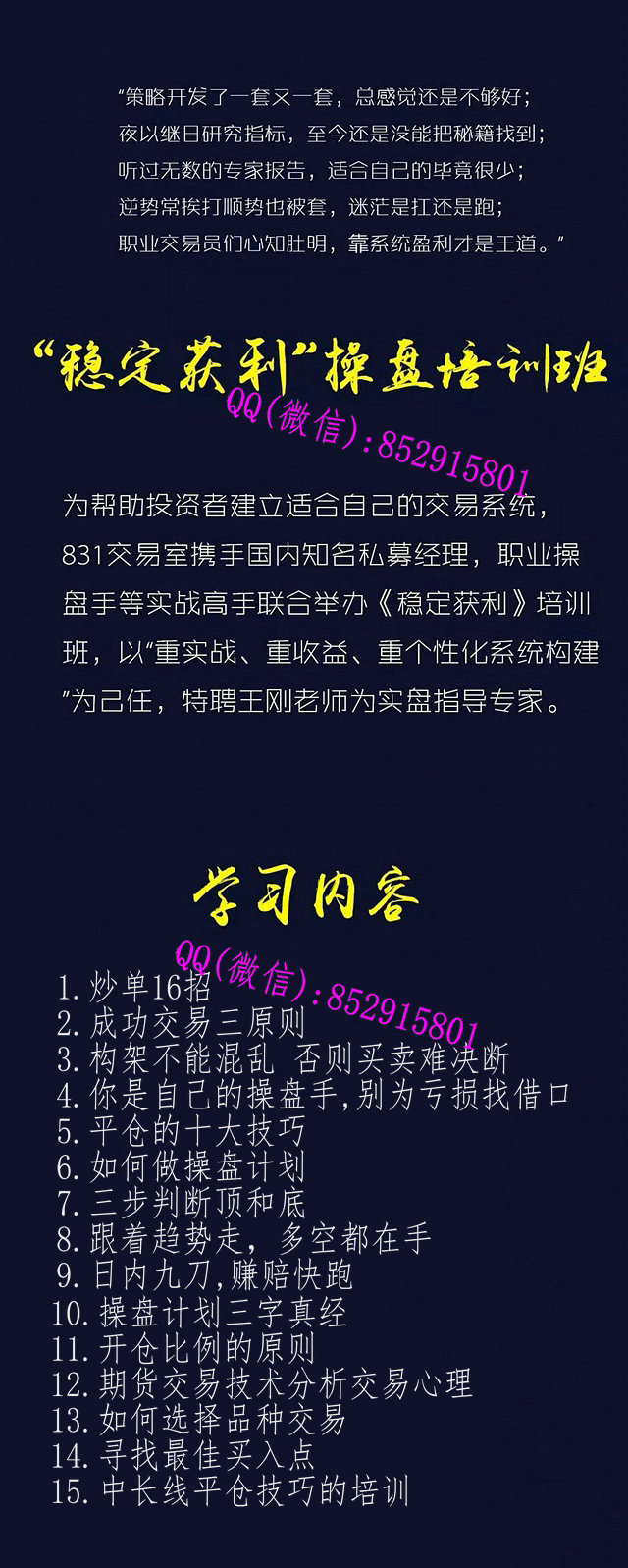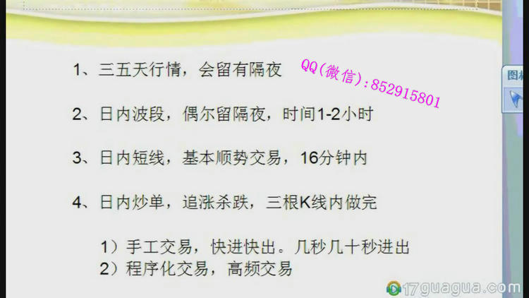 1.炒单16招2.成功交易三原则3.构架不能混乱 否则买卖难决断4.你是自己的操盘手,别为亏损找借口5.平仓的十大技巧6.如何做操盘计划7.三步判断顶和底8.跟着趋势走,多空都在手9.日内九刀,赚赔快跑10.操盘计划三字真经11.开仓比例的原则12.期货交易技术分析交易心理13.如何选择品种交易14.寻找最佳买入点15.中长线平仓技巧的培训