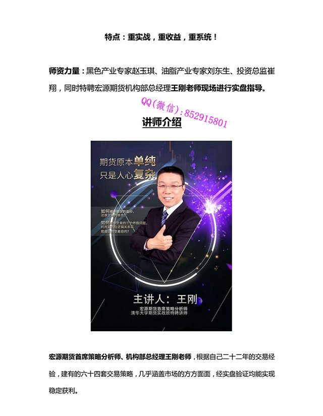 王刚老师,期货舵手之称,宏源期货首席策略分析师、机构部总经理。根据自己二十三年的交易经验,建有的六十四套交易策略,几乎涵盖市场的方方面面,经实盘验证均能实现稳定获利。