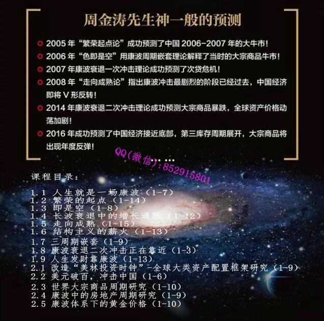 2016年成功预测了中国经济接近底部,第三库存周期展开,大宗商品将出现年度反弹!学习内容:1.1 人生就是一场康波(1-7)1.2 繁荣的起点(1-14)1.3 即是空(1-8)1.4 长波衰退中的增长通胀(1-12)1.5 走向成熟(1-15)1.6 结构主义的薪火(1-13)1.7 三周期嵌套(1-9)1.8 康波衰退二次冲击正在靠近(1-3)1.9 人生发财靠康波(1-13)2.1 改造“美林投资时钟”-全球大类资产配置框架研究(1-9)2.2 美元破百,冲击中国(1-6)2.3 世界大宗商品周期研究(1-10)2.4 康波中的房地产周期研究(1-9)2.5 康波体系下的黄金价格(1-10)涛动周期分析:库存周期,是经济增长中的最小周期单位人类社会任何的反转点的基本机制就是人的投机行为2016年将是未来四年中最好的年景9年一个中周期循环,平均8.6年(3个库存周期)2017年美元牛市结束,人民币加速国际化(点评:这个判断很牛逼)