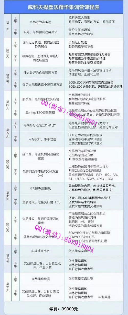 第八天:上午:训后建议,集训只是学习的起点(市场揭露和公众的心理弱点,养成内线思维的习惯,初始交易的资金管理方案)下午:若是出现和破冰交易策略(SOW/BOI行为识别和内涵解读,进场时机,进场后的危机处理)