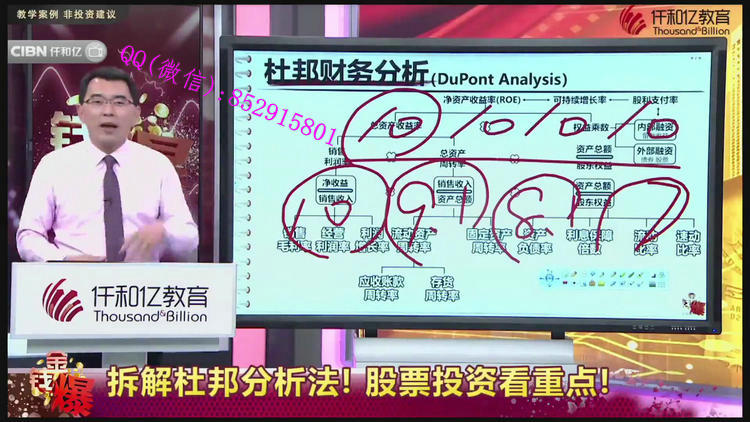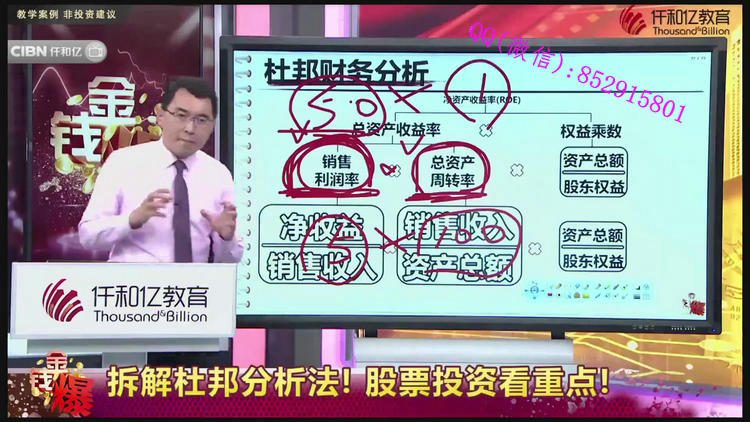 杨世光,全球唯一预知趋势、领先行情的财经资讯节目。台湾东森财经新闻台资深主持人杨世光带领最专业的金钱爆团队以深入浅出方式笑谈经济、另类观点预判趋势、精准眼光透视行情。 课程目录: 第一堂课:读财报没有那么难!资产负债表篇 第二堂课:读财报没有那么难!利润表、流量表 第三堂课:读财报没有那么难!从估值找价值 第四堂课:拆解杜邦分析法第一招 第五堂课:拆解杜邦分析法第二招 第六堂课:拆解杜邦分析法实际案例 第七堂课:理论模型学投资!投资指标介绍(1) 第八堂课:理论模型学投资!投资指标介绍(2) 培训视频截图: