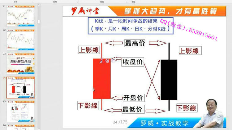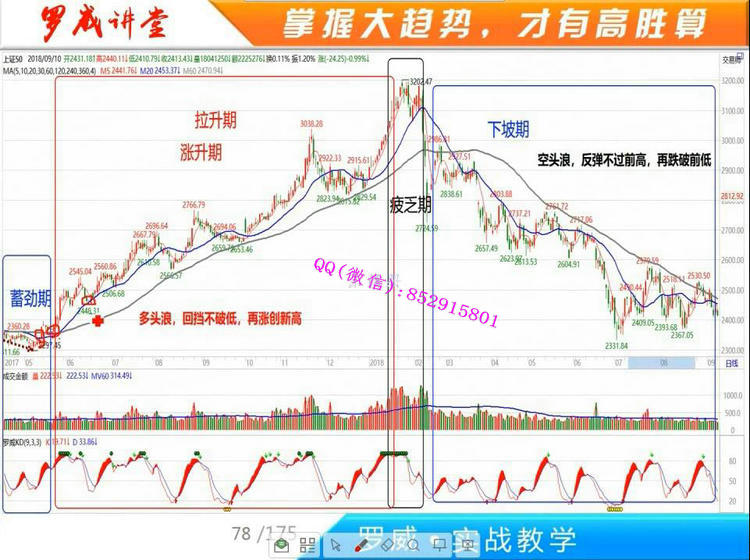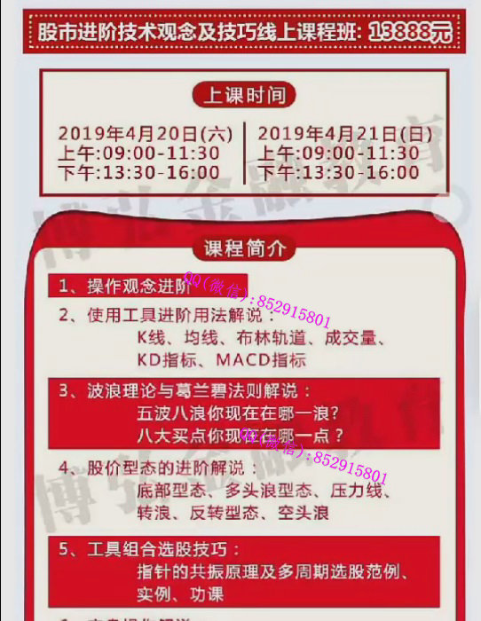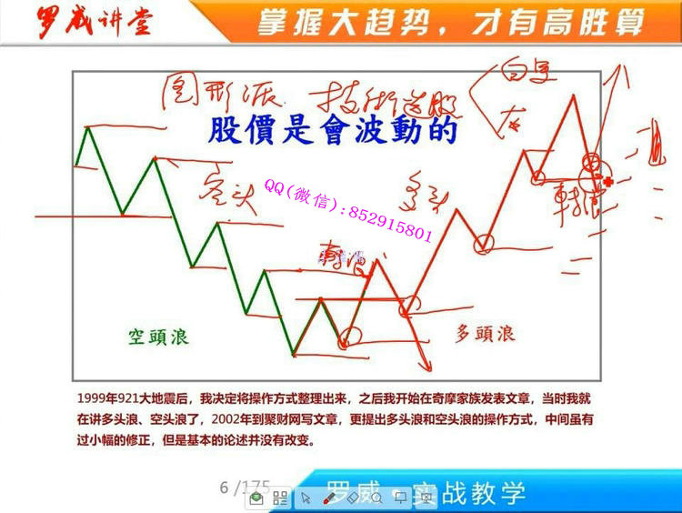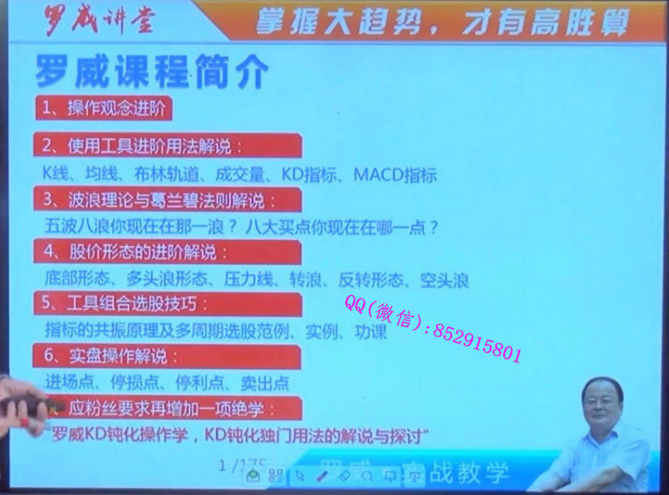 罗威课程简介:1、操作观念进阶2、使用工具进阶用法解说K线、均线、布林轨道、成交量、KD指标、MACD指标3、波浪理论与葛兰碧法则解说五波八浪你现在在哪一浪?八大买点你现在在哪一点?4、股价形态的进阶解说:底部形态、多头浪形态、压力线、转浪、反转形态、空头浪5、工具组合选姑技巧指标的共振原理及多周期选股范例、实例、功课6、实盘操作解说进场点、停损点、停利点、卖身点7、绝学罗威KD钝化操作学,KD钝化独门用法的解说与探讨培训视频截图: